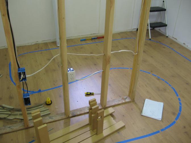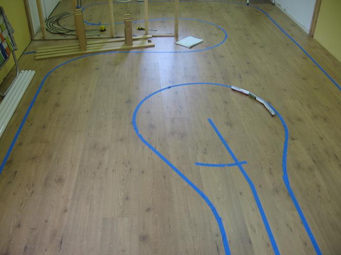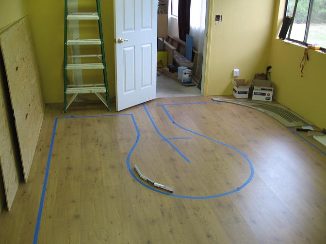 After getting the layout plan finalized, I marked out on the floor using 3M blue tape where the edge of the benchwork will be. This gave me a better idea of how much space the layout will take up and how wide my isles are gonna be. Seeing it on paper is one thing, but real life mockups are totally different. As it was, I had to decrease the diameter of the helix to give me a little better walkway for the yard, since there will always be a warm body there during operating sessions.