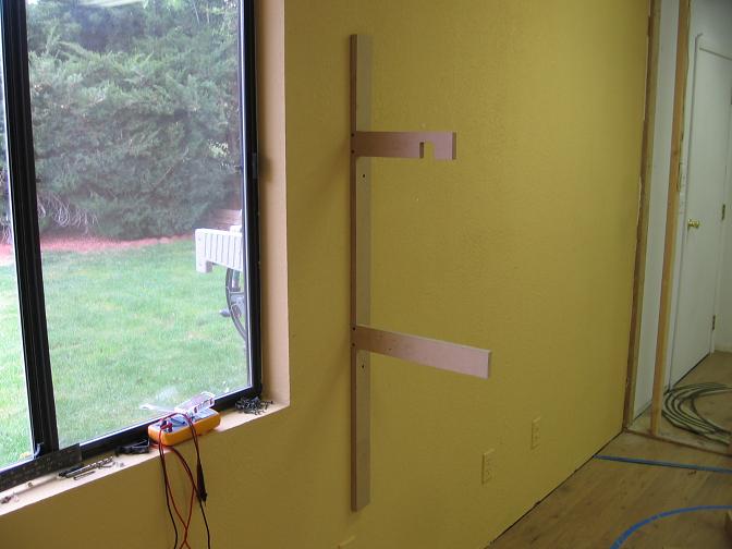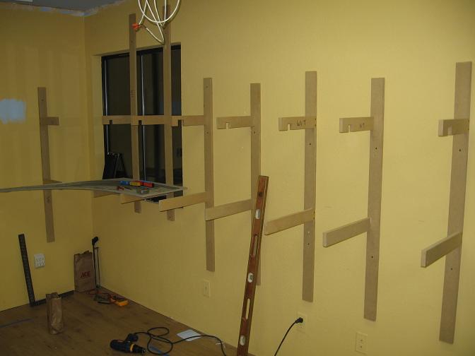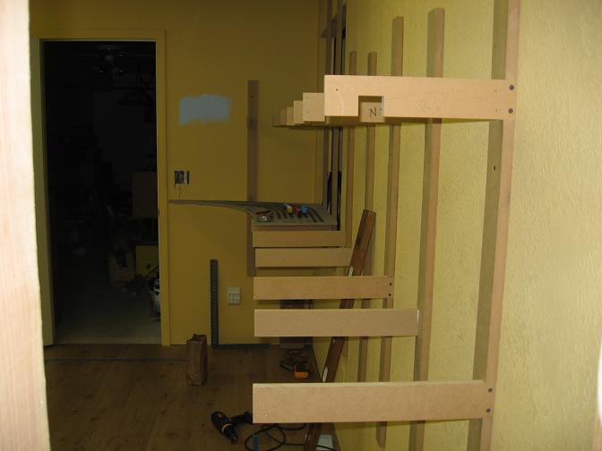 Today also marked the begining of the benchwork, and the first support being installed. For all my vertical wall supports, I use 3/4" MDF cut into 2.5" wide strips 48" long. Out of those, I dado out a slit 2.5" wide, and 3/4" deep at two locations, one for the upper level and one for the lower level. Then the 3/4" x 2.5" horizontal supports are cantilevered out from these, being attached by 2 screws. Once I get a row of vertical supports installed, I use yet another peice of 3/4" by 2.5" MDF dadoed out at each horizontal support to go along the front to tie them all together and strengthen them up. This had worked very well on my previous two layouts. By the end of the day, I had gotten quite a few supports up and leveled.
