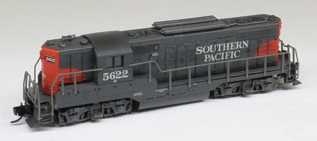 Here we have an older Atlas Torpedo Tube GP9. These came out many moons ago, and they represent the SP GP9's that were used in commuter service. Having the air reservoirs on top of the long hood makes them stand out when lashed up with other GP9s, so I had to get one. There are a few issues with this loco, one being the handrails and trucks are an off grey compared to the rest of the loco. That was changed with spraying of Modelflex paint. The other issue that I will have to look the other way on is the red wing on the rear of the long hood. When these were renumbered and went into general service, the rear red wing was painted out, leaving only the short hood wing. Compromise! All in all, this was a fun little loco to detail up.
