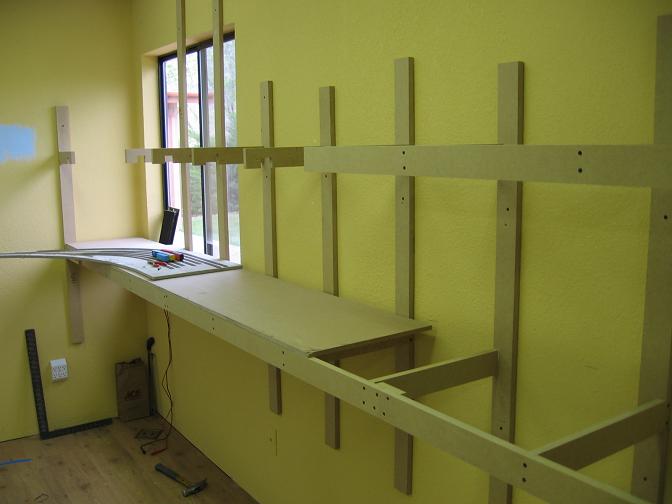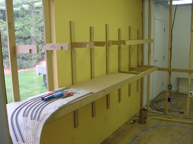 Work is moving right along! I put down the sub roadbed for the yard area, which is 1/2" MDF. Since I put a benchwork support on every wall stud, which is on 16" centers, I highly doubt I'll have any saging. Along with the sub roadbed, I also got in the supports for the peninsula. Again, I ran a piece of 3/4" by 2.5" MDF along all the wall studs, secured to each one. That gave me a super strong base. On top of them, I added cross bracing at different lengths to give me an outline of the turnback "blob". Each cross brace will support both sides of the peninsula.