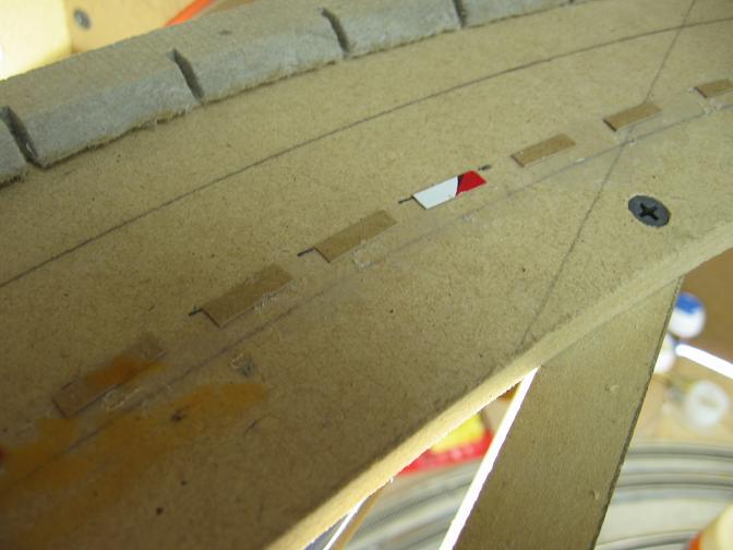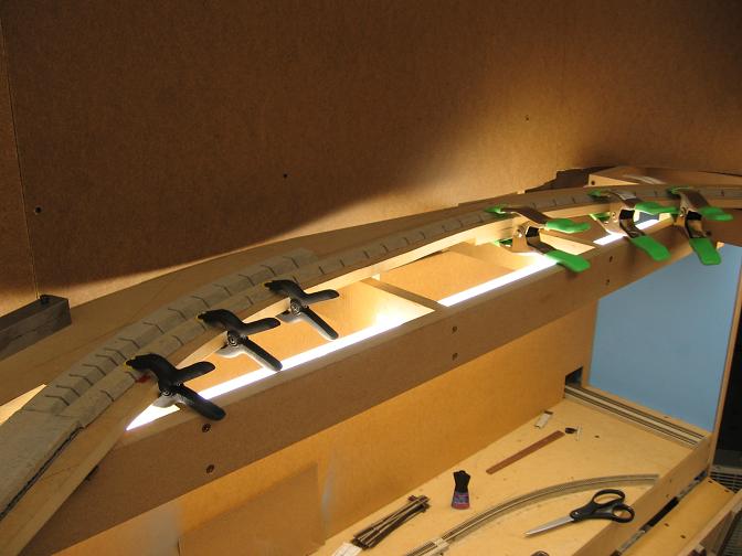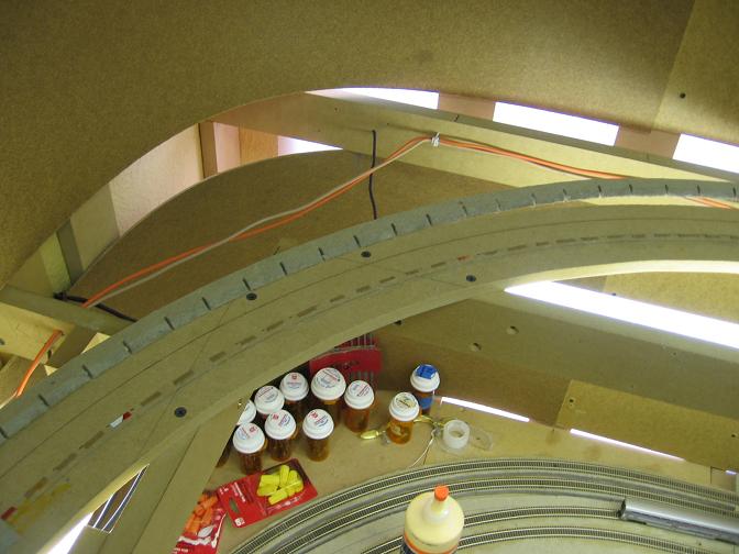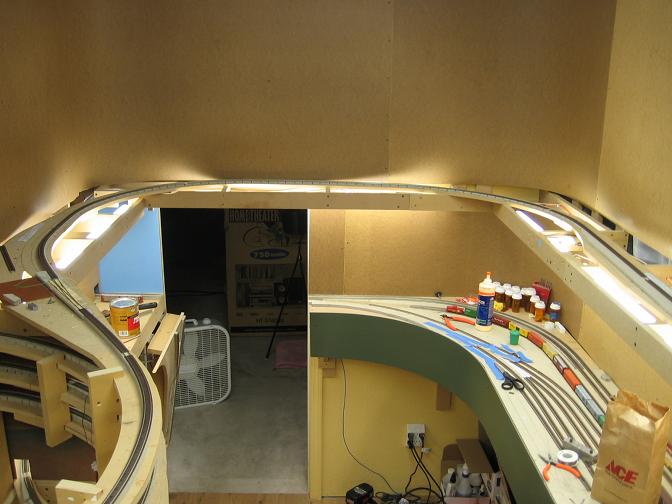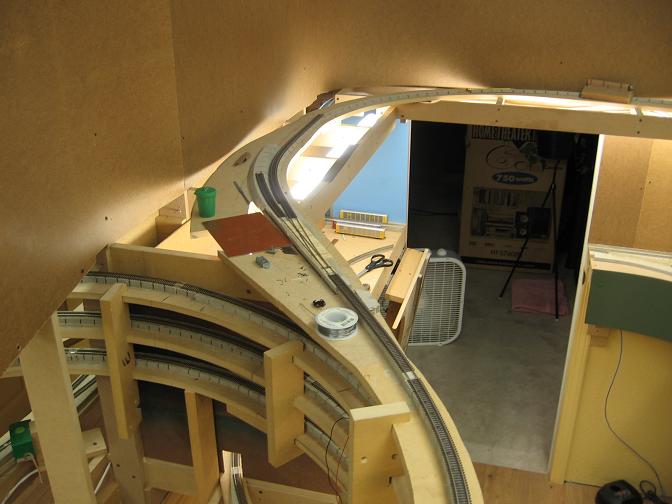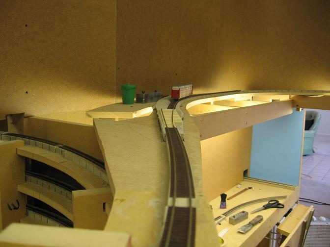 Ok, enough with the diesel detailing! It's back to work on the layout for a change. Due to a fall I took while skateboarding 2 weeks ago, and the surgery I had just one week ago to pull my fractured cheekbone back into place, I've had some time off of work. And what better way to spend it that working on the layout. Since I had already glued down the ties for the south turnout at June Lake, I decided that would be a great place to start at. Originally, the turnout was to be a #10, but after spiking some track down, I had to make the diverging route a bit less sharp, so it came out to be a tad over a #11. I also had to sand down the homasote a bit to match the shims I put under the passing siding homasote. Once that was lined up and the test cars were rolling smooth, it was time to glue down the homasote. Just had to add one more thing. Cardboard shims for some super elevation. These were cut from a box of Cheez-It's. After making a pencil line with the homasote, I glued them down around the outside. They are not a real thick shim, but enough for a passing siding. Plus, it doesn't take much to get that "lean into it" look. I continued with the homasote all the way around to across the isle. In this area, I'm going to have a short house track, which will also serve as a siding for the helper units while they wait for a southbound train. While the homasote for the passing siding was gluing, I sat in place the homasote for the main line. I still have to cut out some more cardboard strips and glue it down. But it's ready none the less.With the glue dry, I couldn't resist spiking some track down and running a train around the top. It also confirms that my passing siding here will be plenty long. I also cut the homasote out for the turnouts on the north end of the June Lake siding and am ready to start laying the turnouts. But that's for next update.