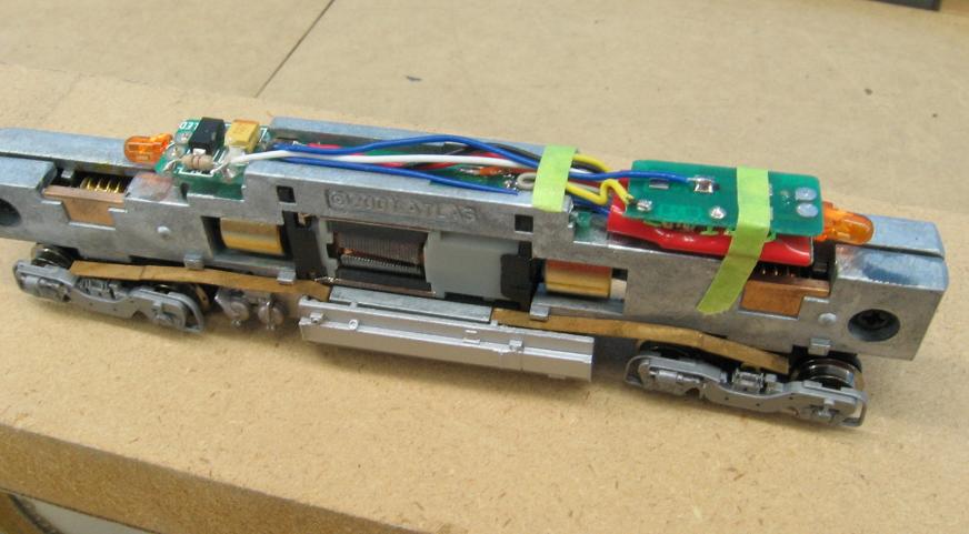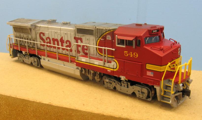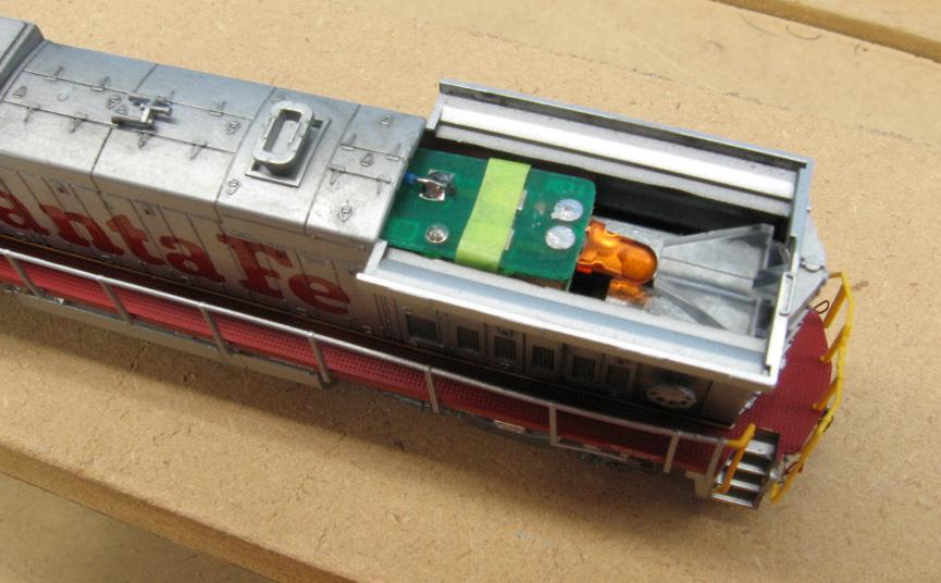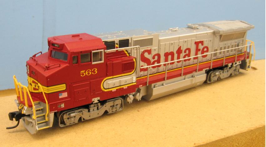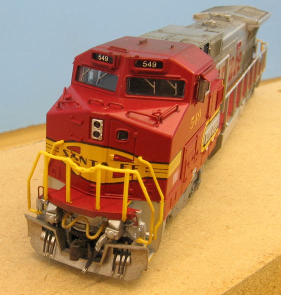 Here we have an Atlas B40-8W, in the Santa Fe red and silver warbonnet scheme. Although this paint scheme is too new for my modeling time frame, I just love the warbonnet paint! Just like the B40-8's, these come pretty well detailed from the factory. Reference pictures were very plentiful on the internet, so it was pretty easy to work on. Compared to some of my other Santa Fe units, this one is very easy to detail up. Atlas supplied the sun shades, plow and large MU cable. The hardest part of detailing this loco was putting in the cut levers in the front. Since the ditch lights go over the front of the cut lever, I had to cut one of the stock mounting pins away and file a groove in the back of each ditch light so they would clear the cut levers. This was the first B40-8W I acquired that did not come with a stock Lenz decoder, so trying to fit a DZ123 in it was a bit of a challenge. On most Atlas locomotives, the DZ123 will slide right under the rear light board, but not on these. I ended up cutting the light board off right at the reat frame mounts. I then unsoldered everything but the capacitor. After that, I flipped the LED over and resoldered it to the underside of the light board, keeping the polarity correct for the capacitor. I then soldered on the yellow and blue wires and taped the light board on top of the decoder. Once this was done, the shell went back on and the decoder was programmed and speed matched. Another loco ready for service!