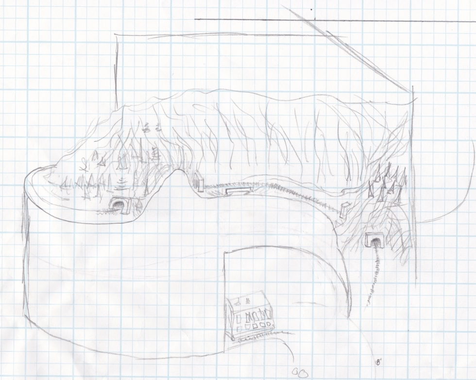 I sketched it out and it seemed to look pretty good. The negative is that the track coming around the top of the helix (left) and the track crossing the bridge (middle) are supposed to be miles apart. And those back to back tunnels on the right? Same thing, miles apart. Now, the mountain scenery is pretty much the same at both of the locations, but I would have a hard time telling visitors that the scenes they are looking at are not meant to be next to each other. I could have put in a view dividing backdrop between both those back-to-back tunnel locations, but the added construction and space they would take up wasn't worth the effort.