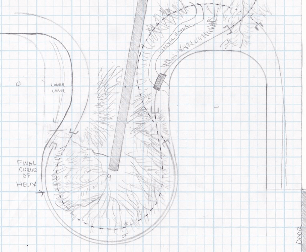 Drawing it out from a straight down view looked pretty good. Curves are within my set parameters, clearances worked out as well, and I could put in some rock wall/retaining wall scenery between the outter most helix curve and the new inner curve.