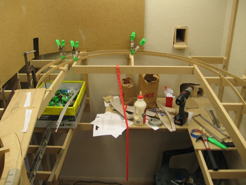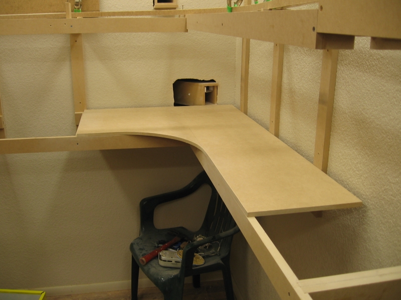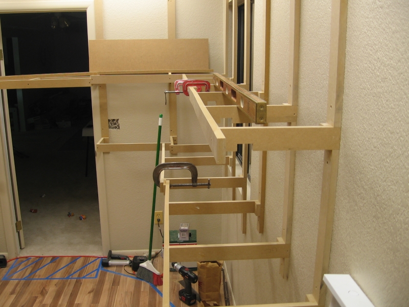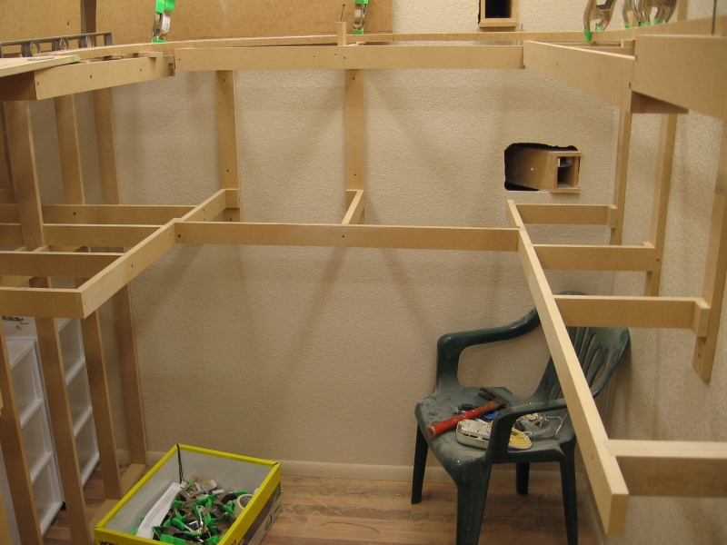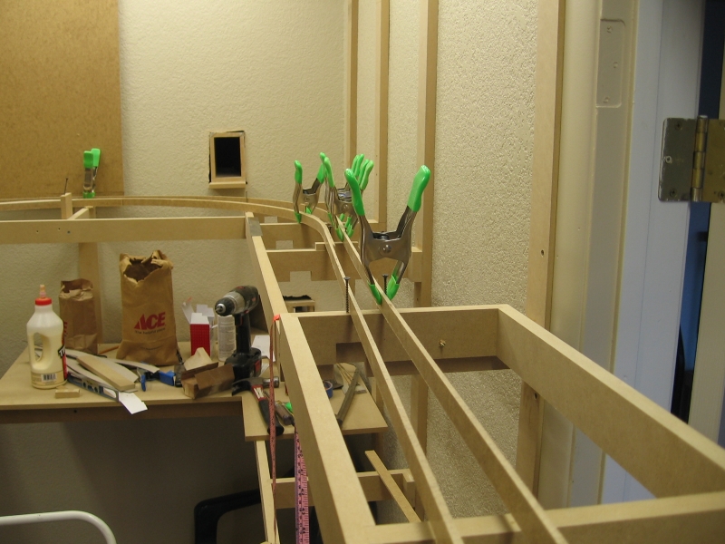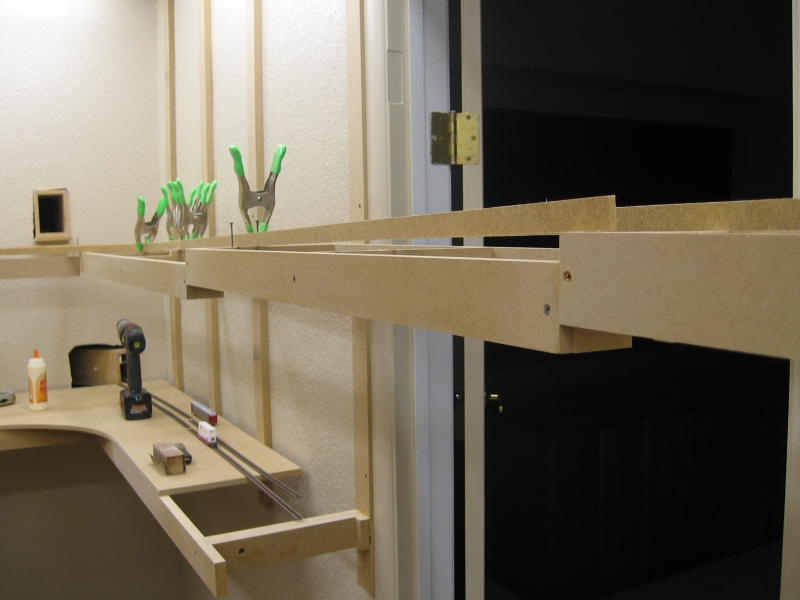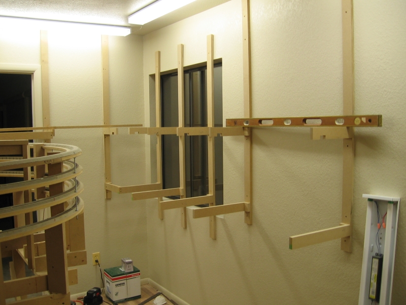 Adding the front runners to both levels. Note the clamp on the bottom level. I had a bunch of left over pieces that were about 1/2" shorter than the 18" I was going to use for the yard. Rather than waste wood, I used those left over pieces, hence the bump out in the benchwork.
