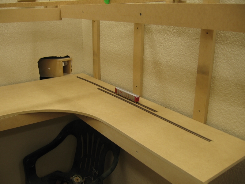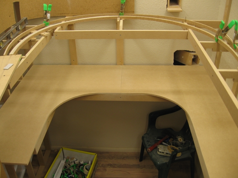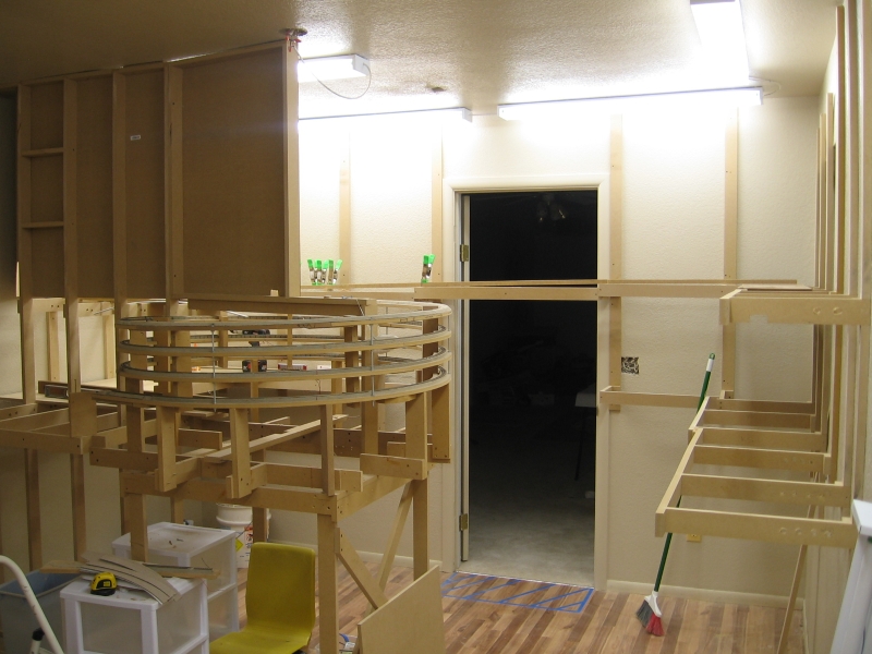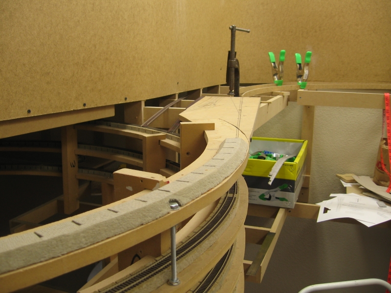 Because I had to drop the helix down one full turn to clear the upper level main, I had to get that last 3" back so the bench work is stepped from the helix all the way to the door entrance at a nice steady 2% grade.