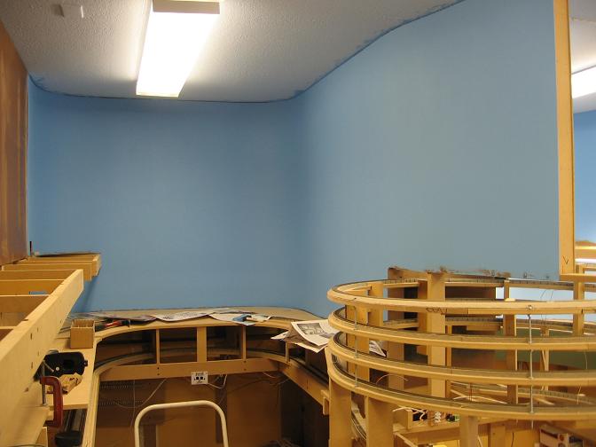 Work and being lazy has been keeping me from getting alot done to the railroad this last month, but I did manage to paint a little bit of the backdrop and wire the rest of the staging yard tracks. I have one staging track left to put in, and it will have a turnout put in it for a removable reverse loop that will be built over the washer and dryer for when I'm by myself and I want to have a train or 2 run while I'm working on the layout. This will be months down the road thou, so for now, I'll just leave the staging yard as is. For the next 2 and a half months, I will concentrat on finishing the backdrop, main line, and dispatch panel for the 2 year anniversary on March 1st.