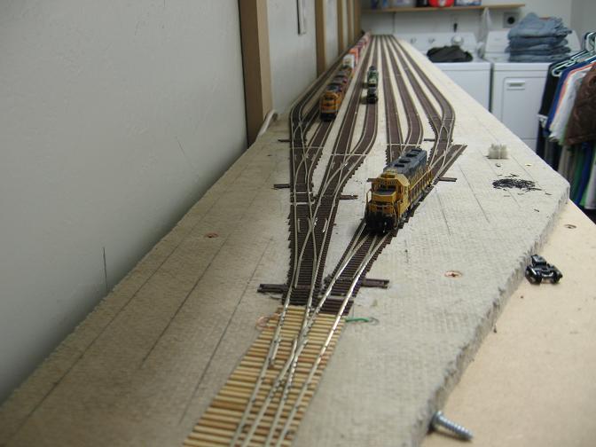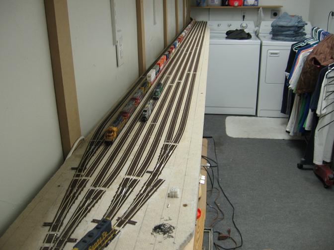 Looking down the lower staging yard. The #10 track will have a turnout put in it about halfway down for a reverse loop that will be built over the washer and dryer.