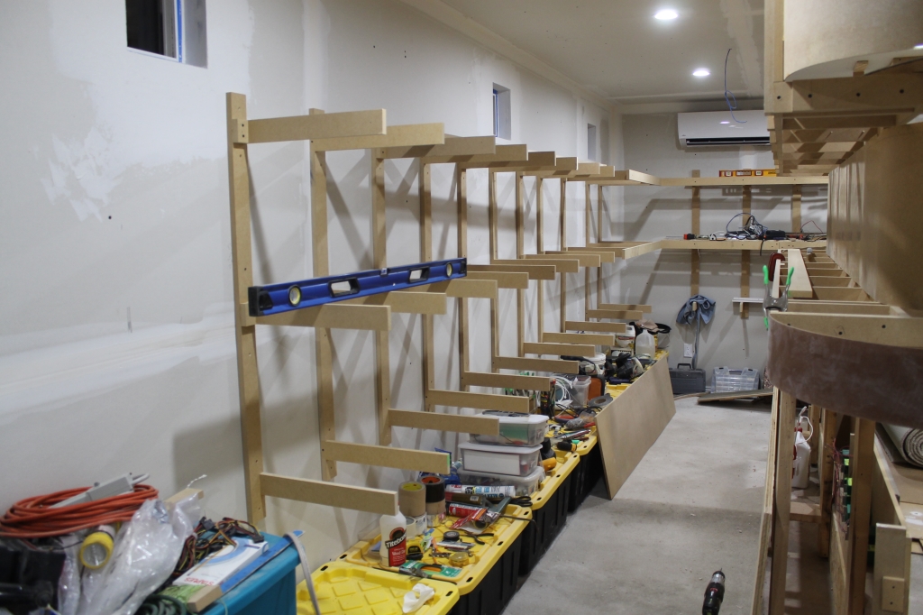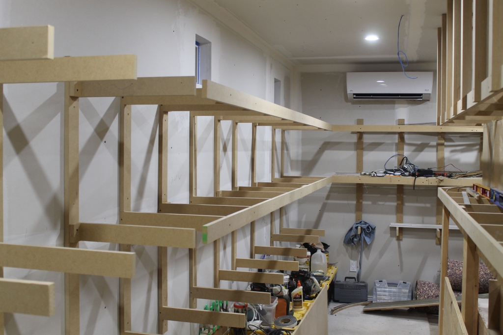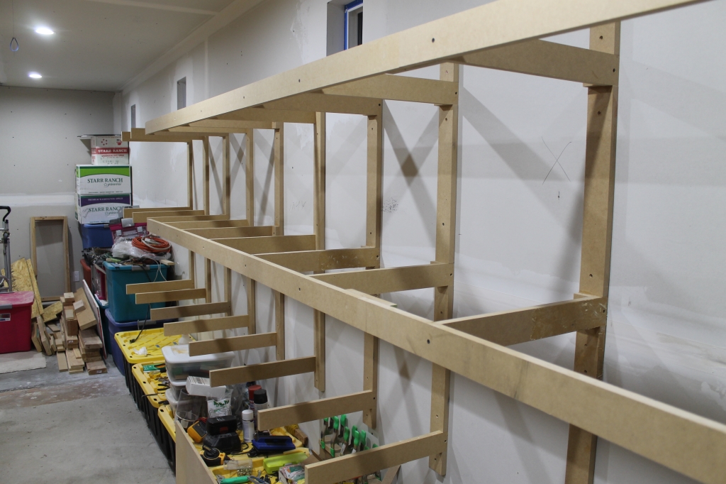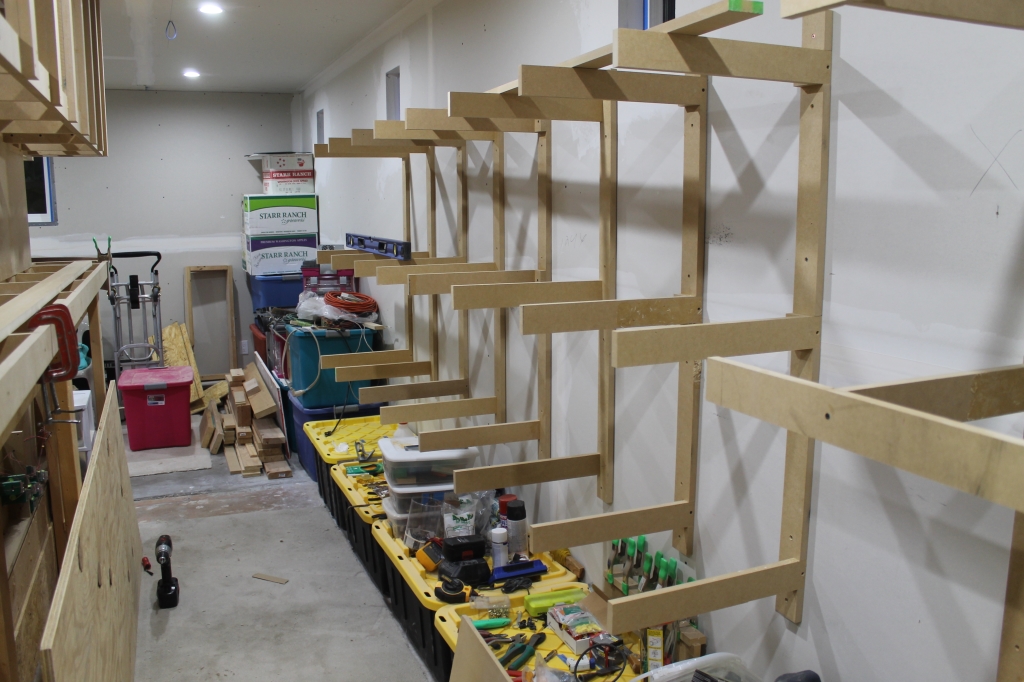 Since the 18" depth is a bit too far for just the 1.5" MDF at the vertical support, I added these 3/4" plywood gussets to try to alleviate any sag over time.