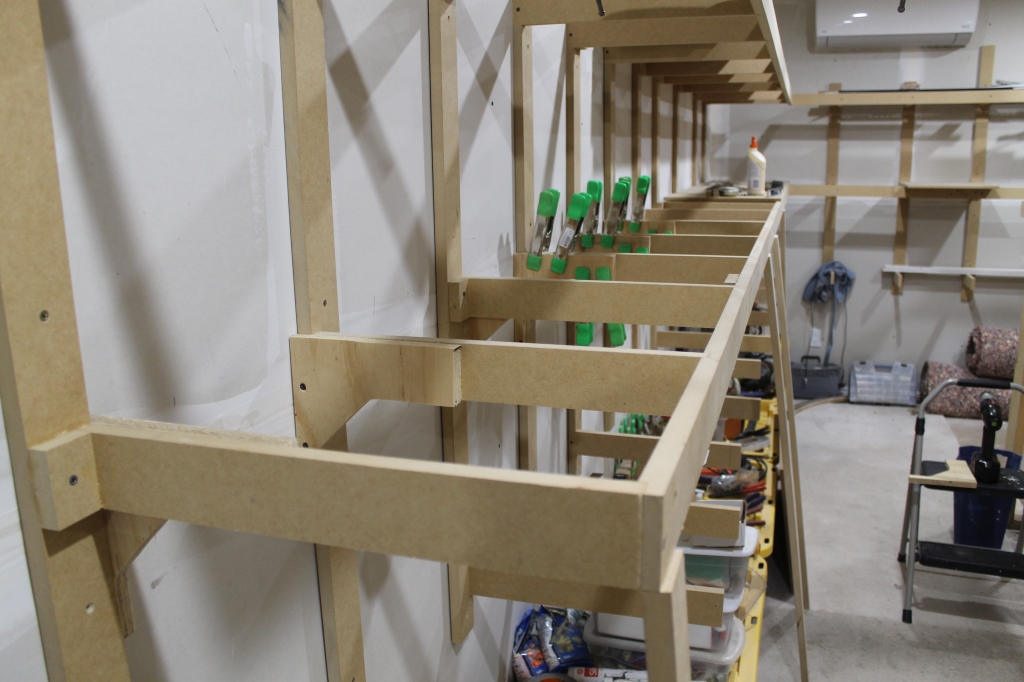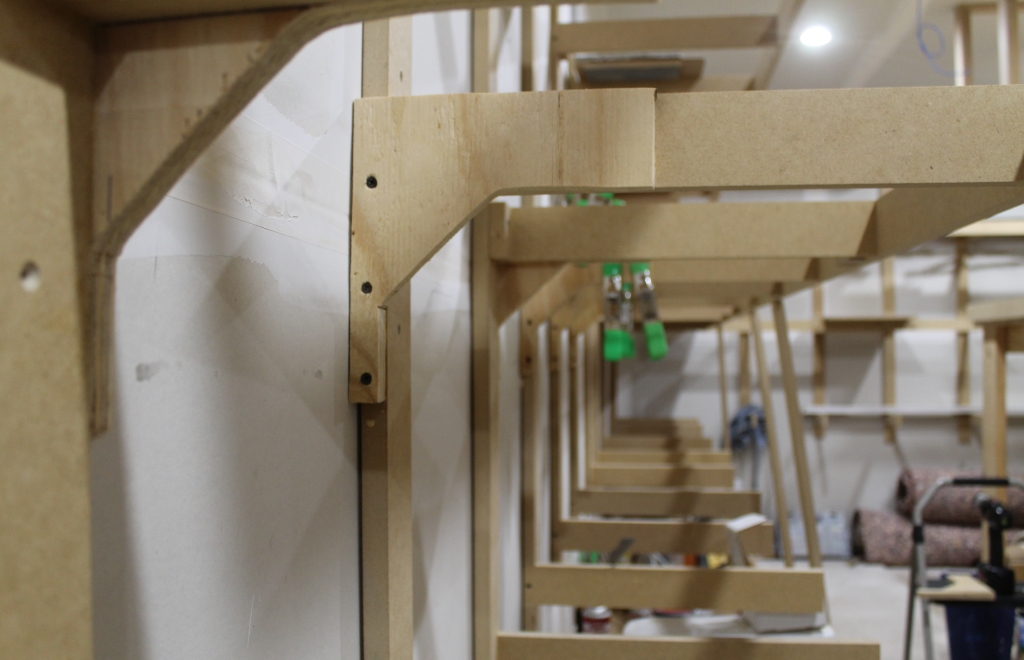 Front MDF facia supports added. Depth of the benchwork is 18" from the wall.