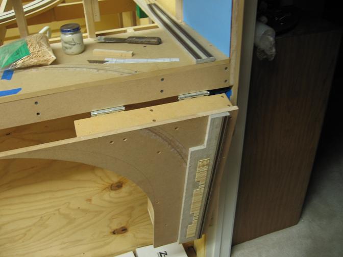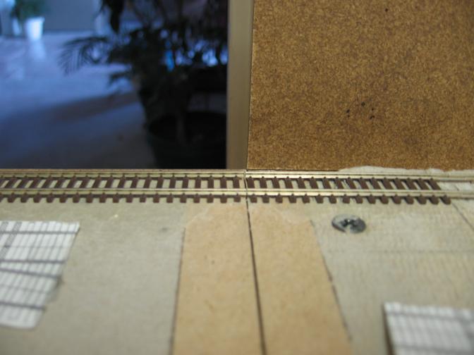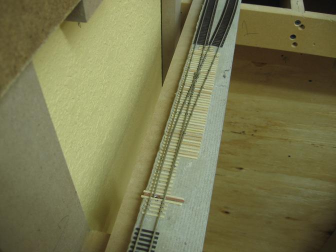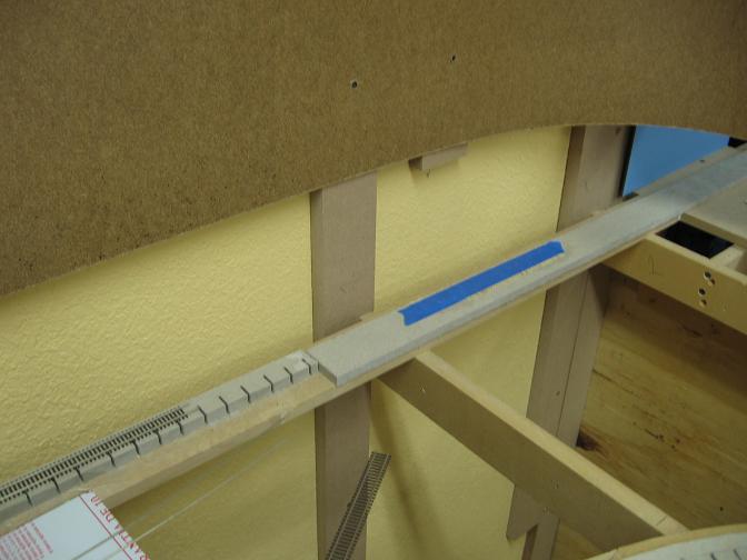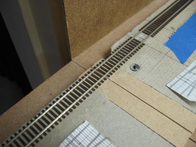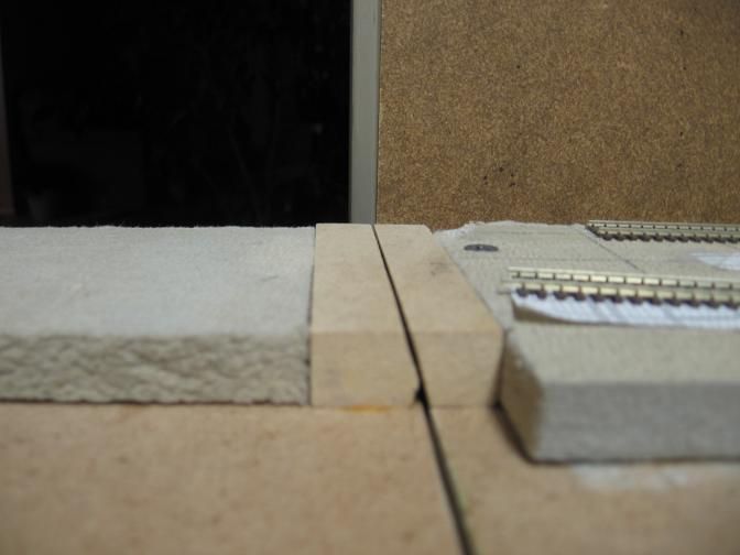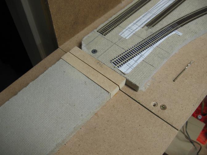 Here is where the drop bridge meets the benchwork. I wanted a better joint than the homasote, so that is why there is 1/2" MDF installed.