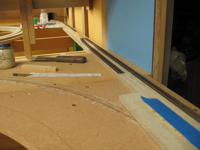 Looking from the drop bridge down the main towards staging. The backdrop will go just behind the putty knife, and I'll end up hiding the hole thru the backdrop with a highway overpass.