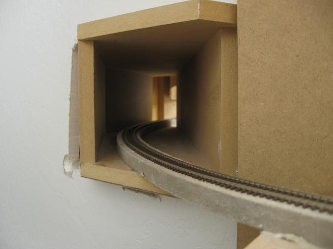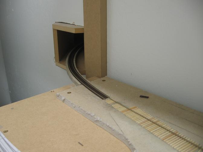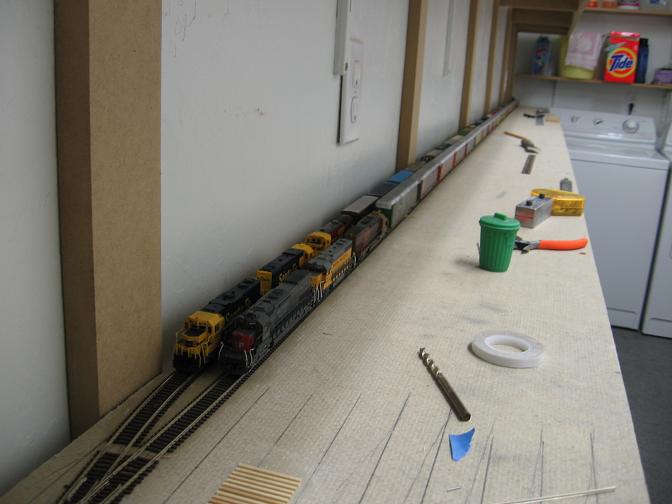 Looking up the throat. There are 2 staging tracks already glued down and I couldn't resist putting some trains on them.
