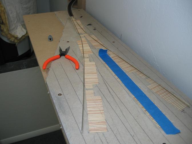 All the ties are glued down and the main chunks of rail are being spiked down.