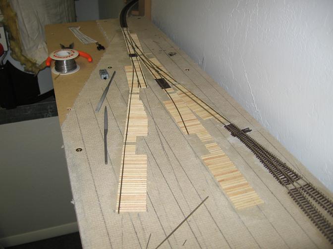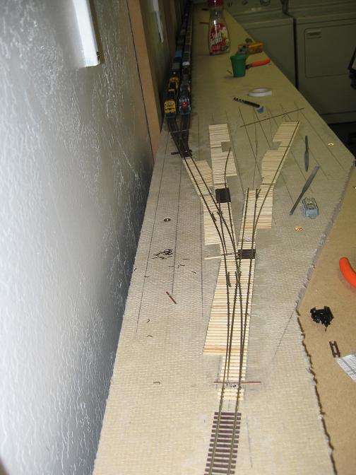 This last couple of weeks has been spent in the laundry room working on the throat for the staging yard. Up till now, I have 3 turnouts installed and 2 staging yard tracks glued down. At the top of the throat, I had to use a commercial turnout, since it was way too difficult to handlay a turnout that close to the wall. I had an Atlas #5 laying around, so I put that in. It doesn't line up perfectly, but it will do. I'm waiting on some Digitrax UP5 pannels to continue the wiring, so untill they come in, I'll keep going on the throat.