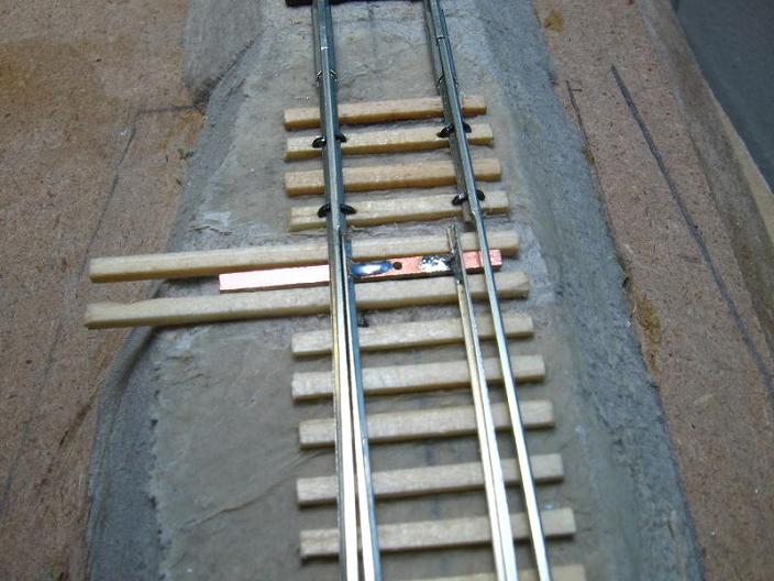 Since the top of the throwbar conducts current across it, it can not touch the point rails and stock rails at the same time, or you get a short. So we need to cut a gap in the throwbar to stop the current from connecting them. Since both closure rail points are connected electricly, we'll need to cut a gap between them and the stock rails.