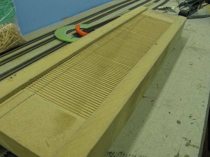 Using a piece of Atlas flex track as a guide, I drew a cut line across the MDF at every plastic tie. This was very time consuming. I left a bit of a flat area on each end of the MDF since I didn't need the cut lines to go right to the edge. I used a 7.25" skill saw blade that measures 1/16" wide put into my radial arm saw to cut the grooves out. The grooves were cut a little less than 1/16" deep to allow the tie to stick up some. Again, this was also very time consuming, but worth it, since I have many times put more than one turnout's worth of ties into the jig to make working at the layout go faster. Here are some pictures.