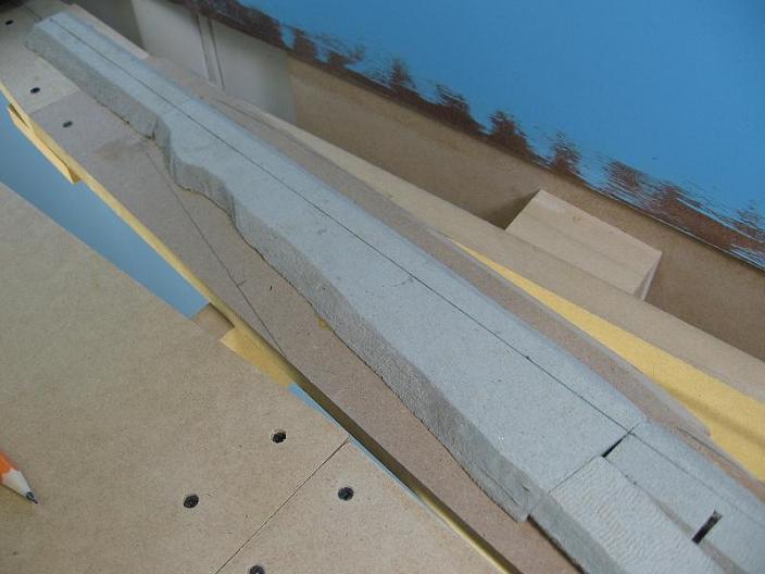 Since I had already drawn the track center line on the wood subroadbed, I then transfer it up to the homasote.