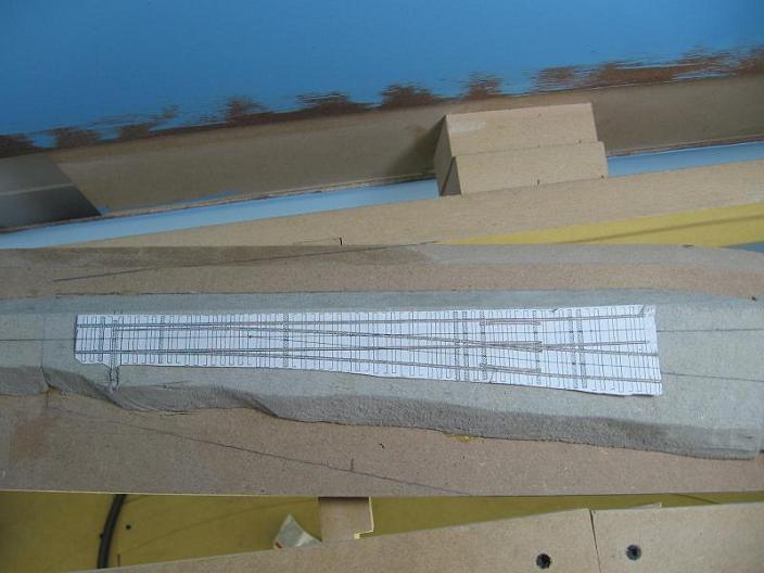 Now that I have my center line, I position the paper template into location. Keep an eye on both the straight route and the diverging route so they line up with the rest of your roadbed/track. Once you are happy with the location of the turnout, take a ruler and draw the diverging route's center line. The paper templates have the track center lines on them to help line everything up.