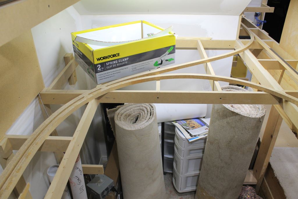 The spline roadbed starts! In hindsight I should have moved that ugly rolled up carpet.