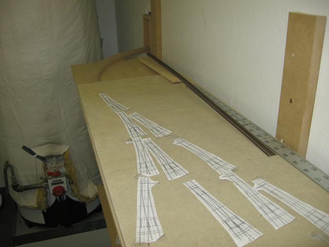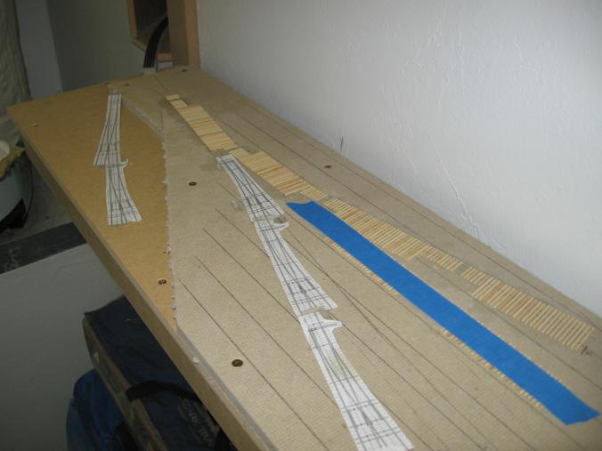 The upper level has the curved subroadbed in place, but the bottom level still needs to be cut out and attached. I've already started to tape down the paper templates for the turnouts.