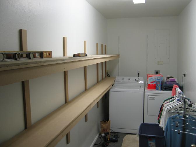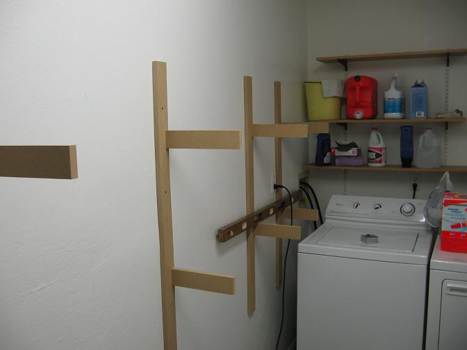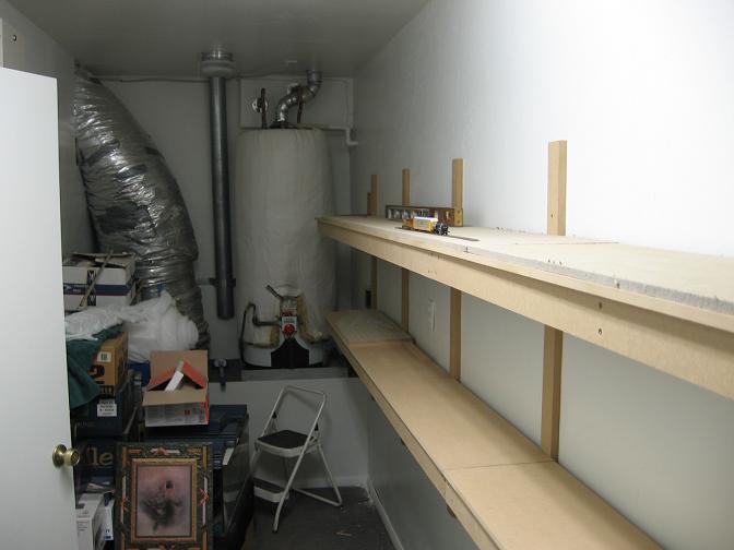 Happy New Year! Christmas is over and my job has slowed down some, so I can get back to work on the layout. In this update, I have completed the benchwork for the staging yards which are located in the laundry room. It was a nice warm day out, which was the first one in quite a while, so I dug the table saw out and cut up some more MDF for the benchwork. The staging yard benchwork was built just like the rest of the layout, except I attached the vertical supports to every other wall stud. Subroadbed is 1/2" MDF with 1/2" homasote on top. For both the top and bottom level staging yard thoats, I'm going to be handlaying the turnouts. Why do that, its just the hidden staging yard, right? Well, I have more time than money, and to use Atlas turnouts for all of it would cost around $200. I can handlay them for a fraction of that cost. So you will see that I've already glued down some ties. The length of the staging tracks are about 14', which is 3-5 locomotives and 30-35 cars.