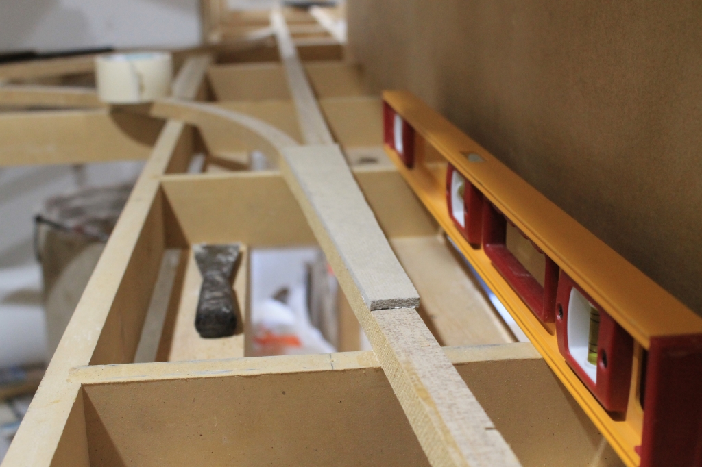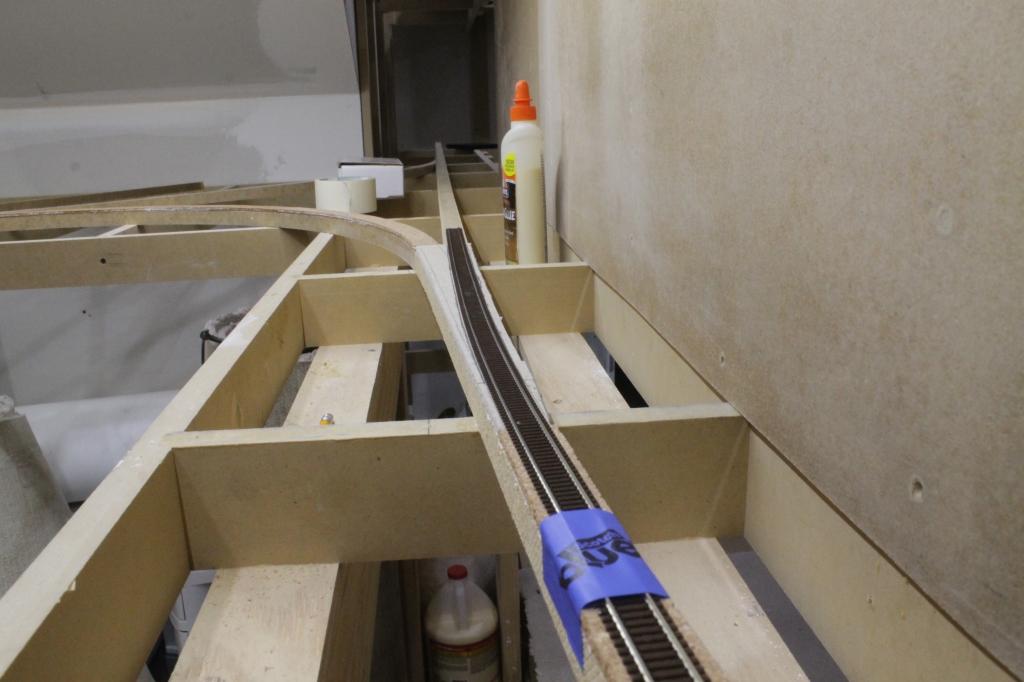 After getting those backdrops up and some spline down, I wanted to start on some trackage. Up to this point, I hadn't handlaid a turnout for over 3 years. So I figured I'd start with an easy one at the north end of the wye at Laws. Easy to pull up and replace if I made any mistakes. Once laying the flex track out and tracing each route, it measured out to be about a #11 in size. While doing this, I was having a hard time seeing what I was doing. So I put that on hold and ordered a few different kinds of LED strip lights. Once I found the brand that I was happy with, I installed them around the whole Laws area. Definitely made a huge difference! Then it was back to handlaying that turnout.