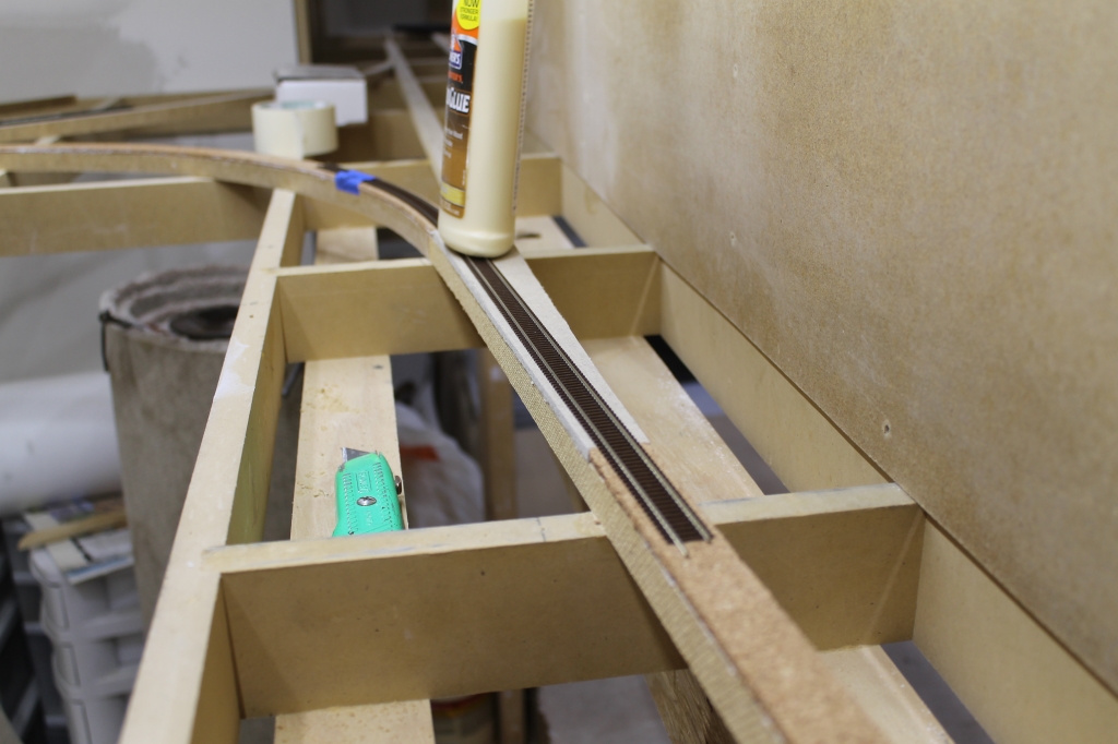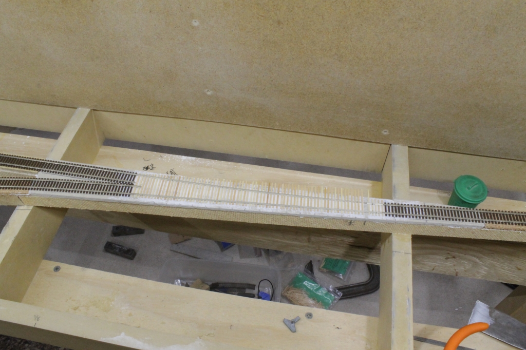 I'm using homasote to spike my turnouts into. This piece has been cut to match the height of the cork roadbed used under the rest of the track. I go into detail about the homasote here: Handlaying turnouts
