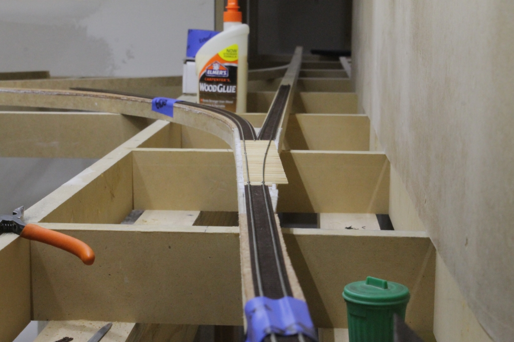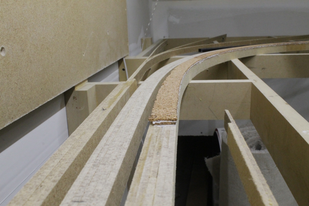 Put some cork roadbed down on this side of the curve. These 2 pieces glued together equal the height of the new cork roadbed I'm using for the rest of the layout. Kinda amazed that these old pieces match up to the new cork. Nothing goes to waste!