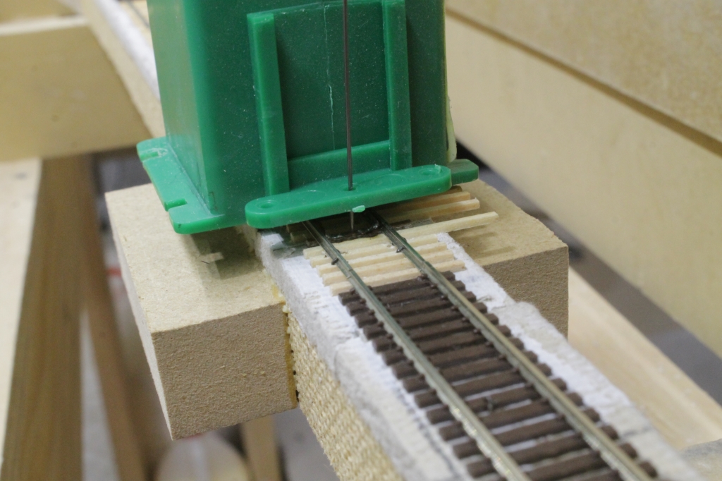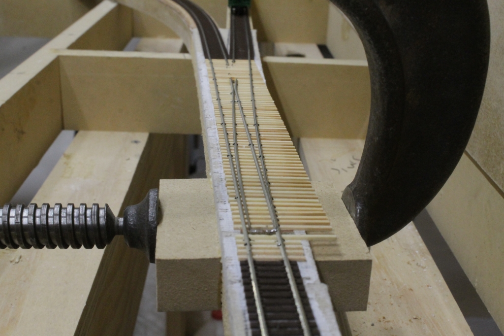 Most of the turnout is spike down. I messed up on the frog point, so that came out and has to be redone. The clamp is holding the wood blocks used to mount the Tortoise switch machine to.