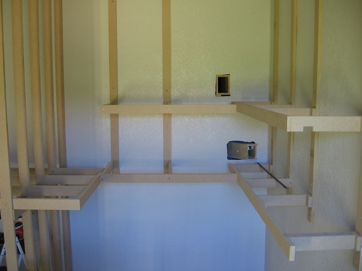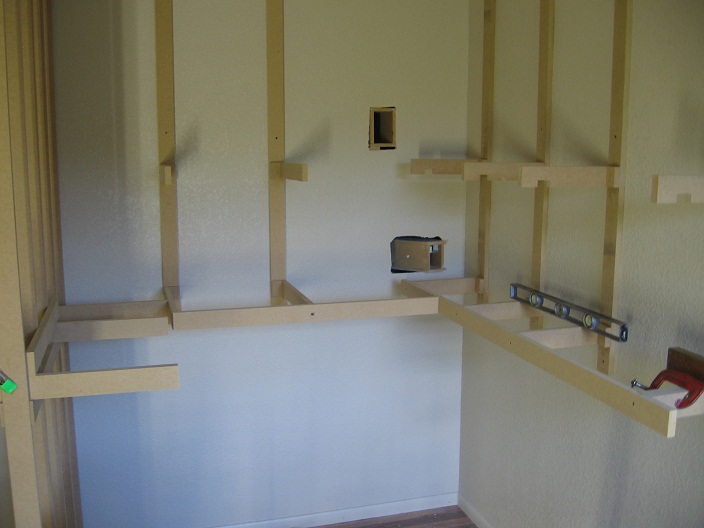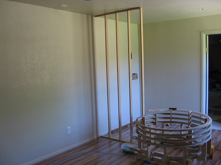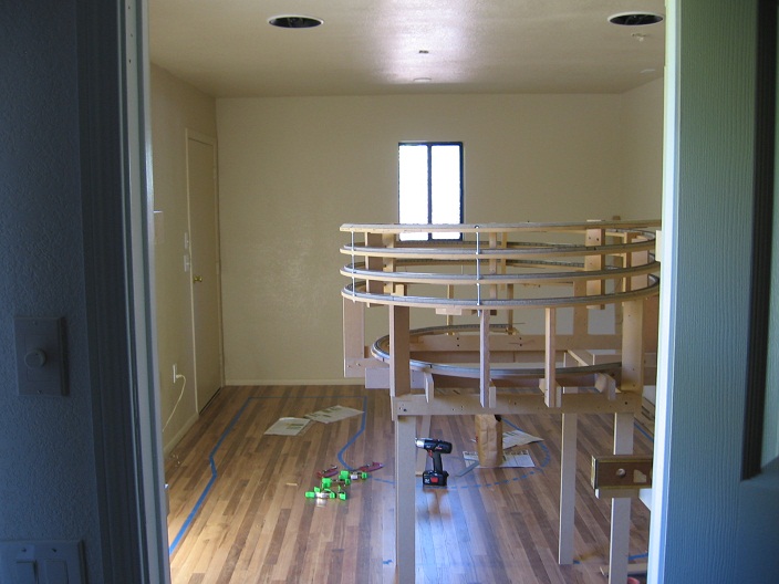 Lots of supports in. Main line will head out from the wall on the right, South Bishop will be straight back and on the left. The Tonopah branch will come in against the wall to the rear left and curve around to meet the Main where the level is.
