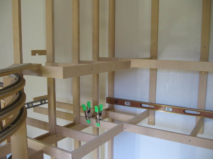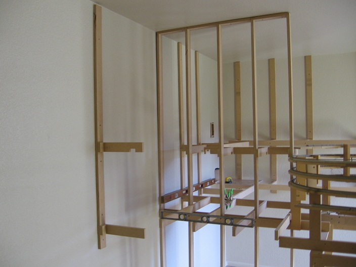 Starting to get the upper level face pieces on. You will notice the upper level supports are quite a bit lower than the hole in the wall. This is needed since the track from the helix will pass around from the left and come out on the right, and will be hidden. The track coming out of the upper level hole in the wall will pass around to the left and curve over the top of the helix and will be visible. Confusing eh.