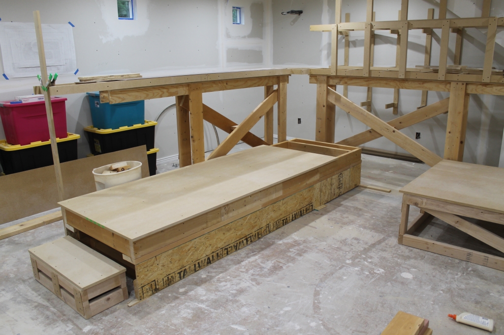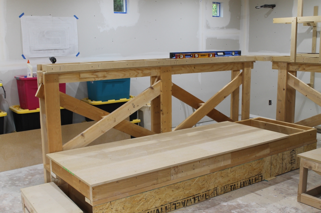 Not too much done in this update. Going up and down a step stool got old quick, so I built part of the raised section of floor that will be used for the inside of the mushroom. Continued with more of the mushroom benchwork.