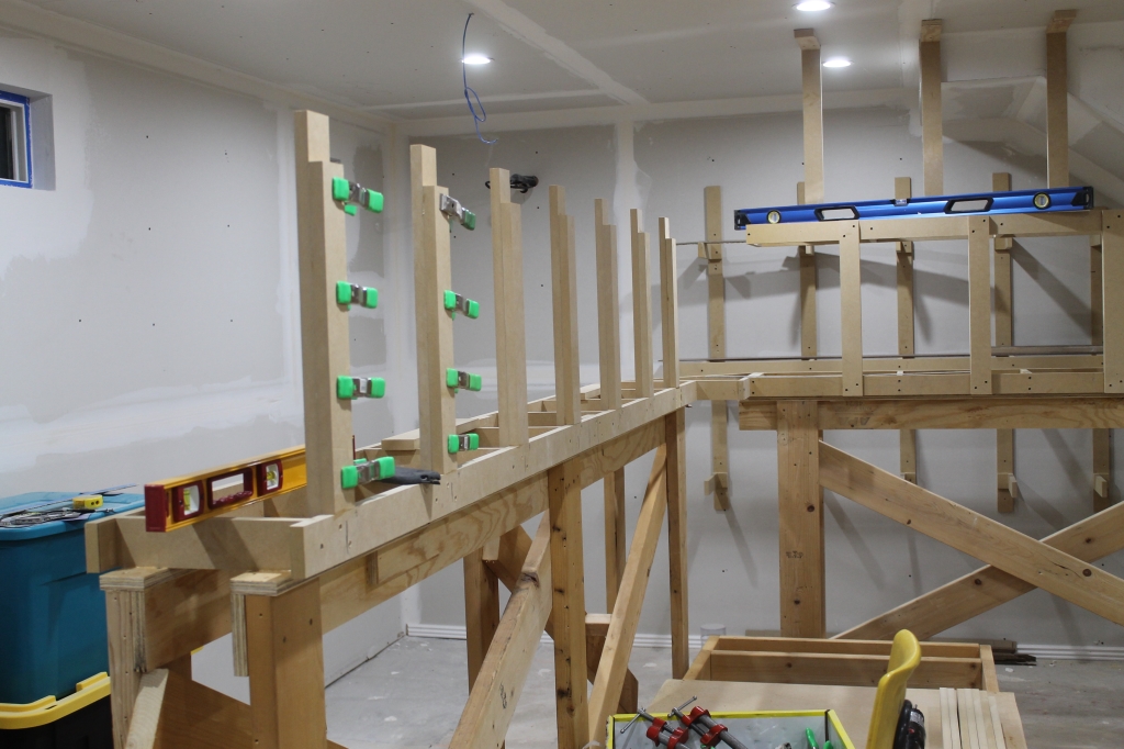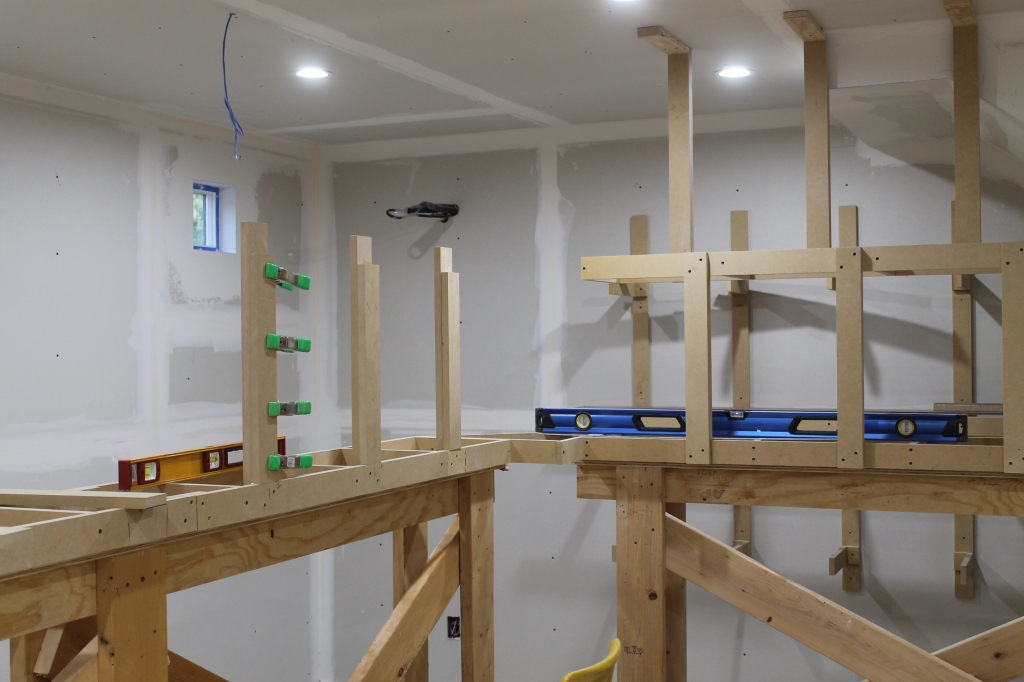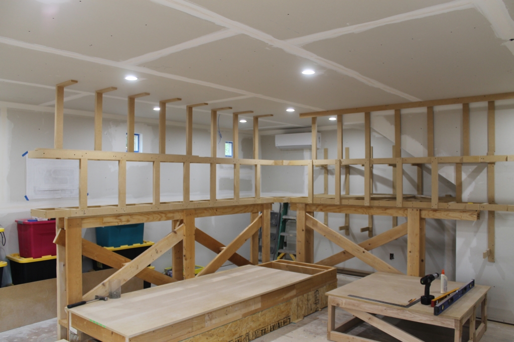 Started on the raised floor for the mushroom. Had to keep enough headroom for some of my taller operators that will come run trains so the floor is only 18" tall while the benchwork climbs 20". So lower level track will be 52" off the floor while the mushroom section of track will be 54" off the floor.