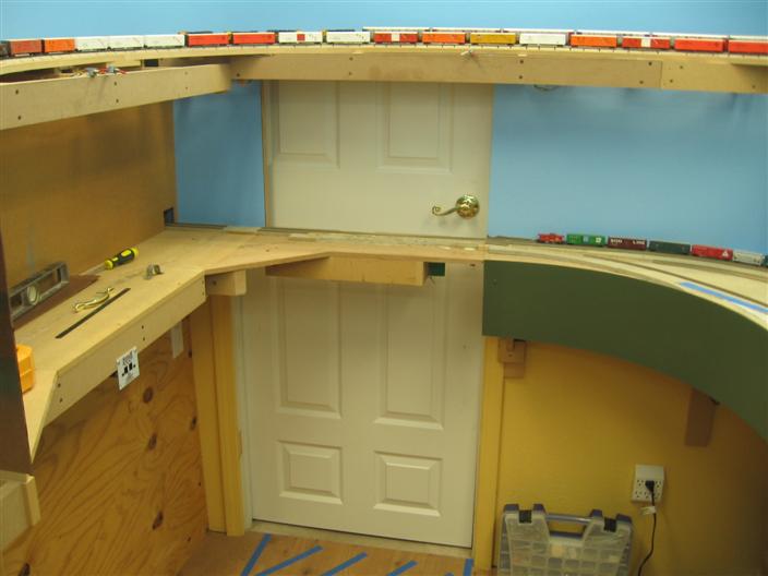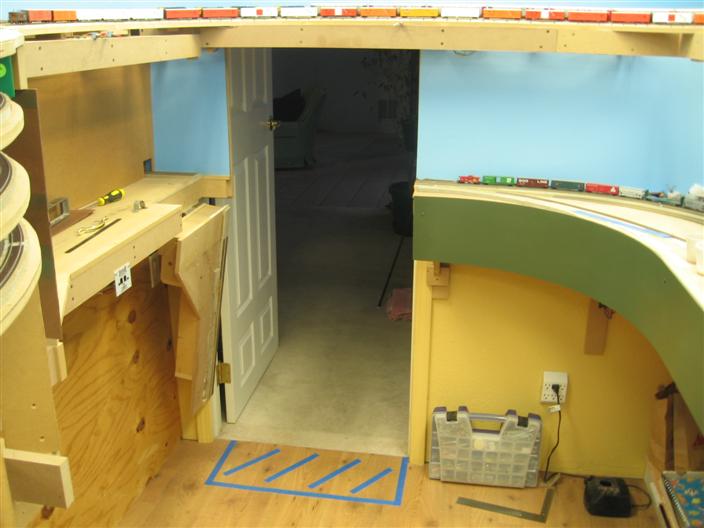 Along with the door, I also put down some blue tape to help remind people that they are not just ducking under a thin piece of wood, but that there is almost 12" of benchwork too. Seems everyone that comes over to see the layout lifts their head up too fast and hits the benchwork.