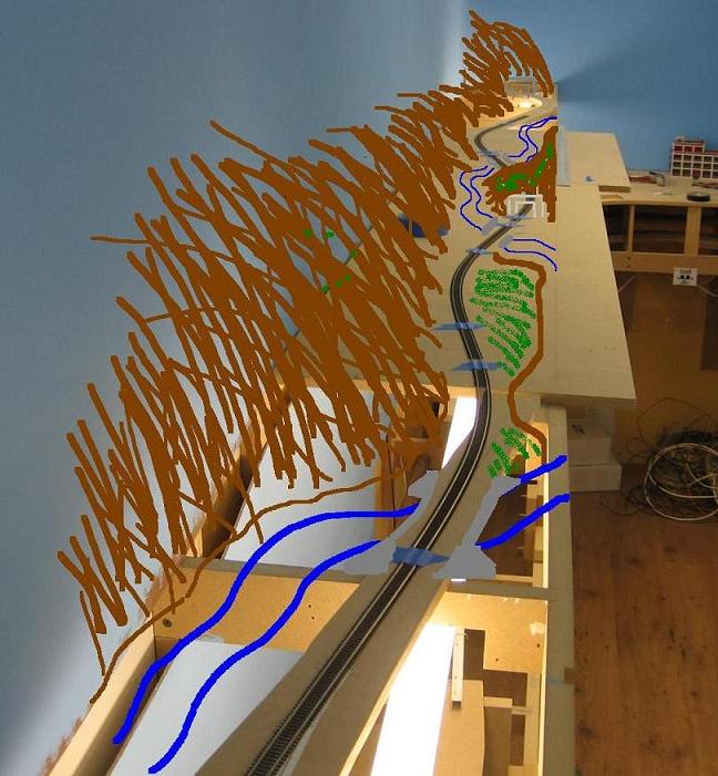 This was a MS paint mockup I did of the area when I was constructing the subroadbed. A little too overzealous. If the area I had was longer, then this would work.