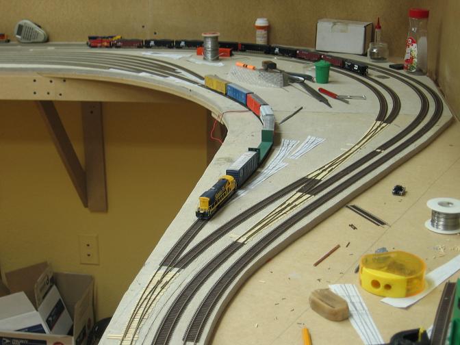 Here is the completed trackage so far. From left to right, you have: Yard Lead, Siding, and Main. All the hopper cars in the rear are sitting on one of the A/D tracks. The area between the yard lead and the A/D tracks is where the Engine Facility will be located at. On the left side of the pic you can see that I have laid out all the yard tracks.
