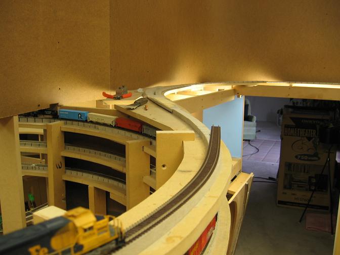 Not much to update at this time; I guess I burned myself out before and during the last update. I did manage to cut out some homasote for the upper level. I also glued down some ties for the yet-to-be-named siding at June Lake, which is right at the top of the helix. One thing that I'm doing with my sidings, is lowering them down some to make them look more realistic. I've been having fun running trains up and down the helix, and detailing more locomotives. Anyway, here is some pics.