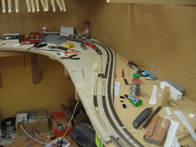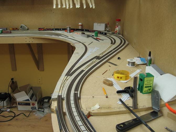 Here is a far away shot. All the yard throat turnout ties are taped together and hanging from the upper level, waiting to be glued down.