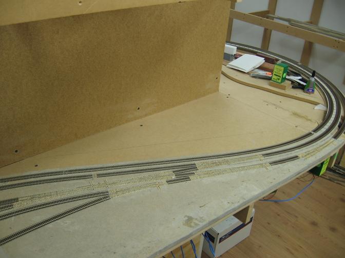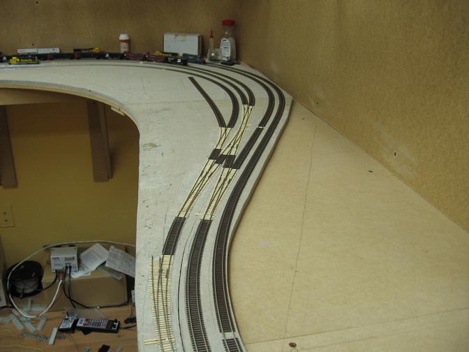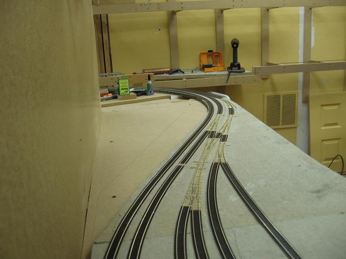 The downfall to this was that the yard throat will eat up more area and have to be compressed a bit more, and the yard tracks were not going to be as long as I had wanted. So I left the track taped down for a week or so and thought about it. As you can see in these pics, I decided to go that route.
