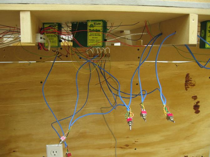 I have also started installing the Circuitron Tortoise switch machines, and all the wiring that goes along with them. The toggle switchs are DPDT.