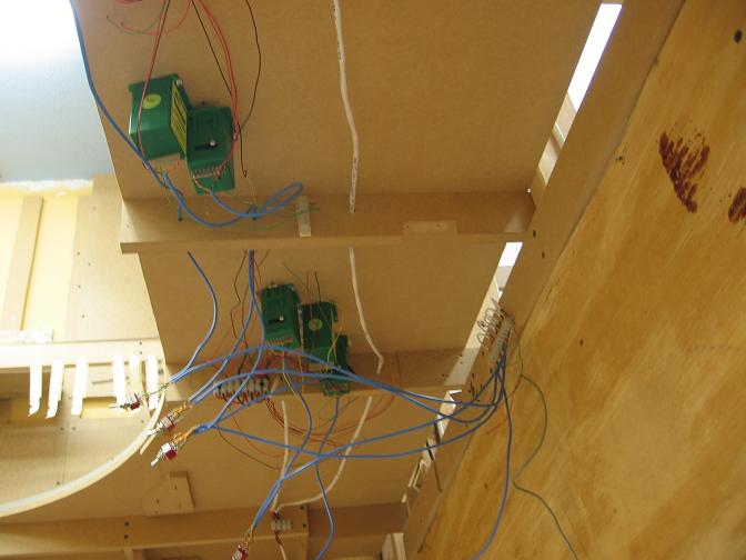 Looking up from below. With an exception of the 14awg White wire (which is used for the track bus), all the wiring is 4 conductor phone line, with the outter colors going to different things. Here I have made Light Blue the color for local switch machines. I have a friend that installs home security, so he gives me what is left over from his jobs. Can't pass up free wire!