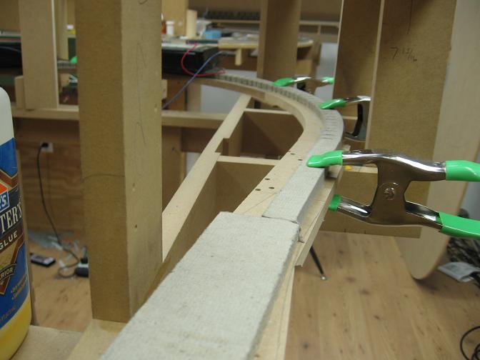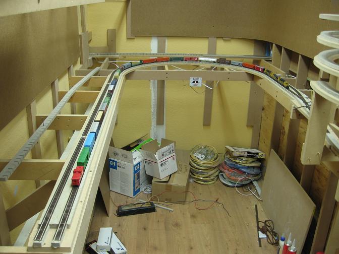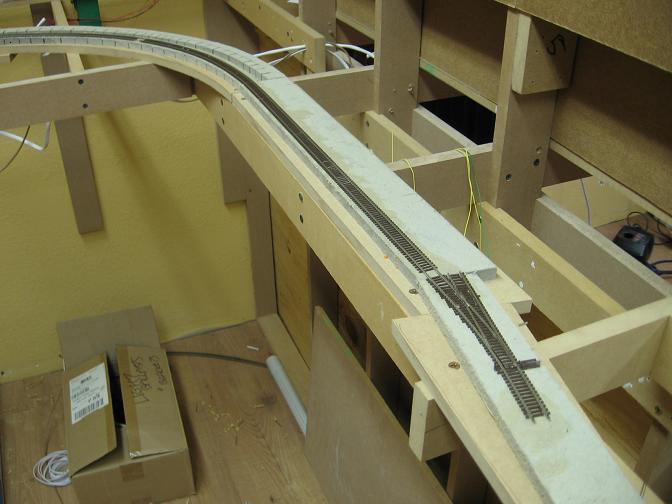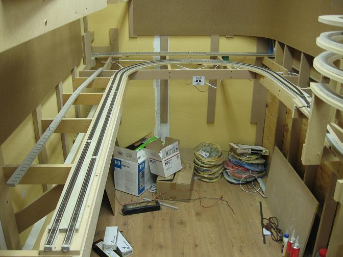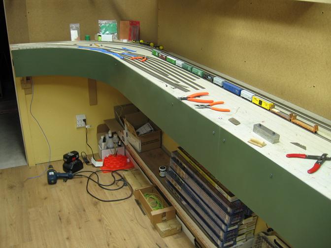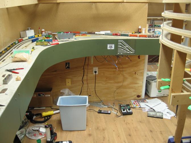 Here are the 2 staging tracks completed. The track in the background (above the green switch machine) is the main line going into the laundry room to staging. This area will eventually be covered up by the town of Mammoth, 7" above the track, as the hardboard backdrop shows.