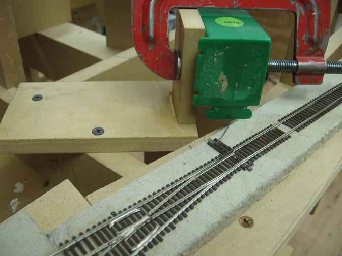 Close up of the Tortoise switch machine and the bracing I had to put together to hold it.