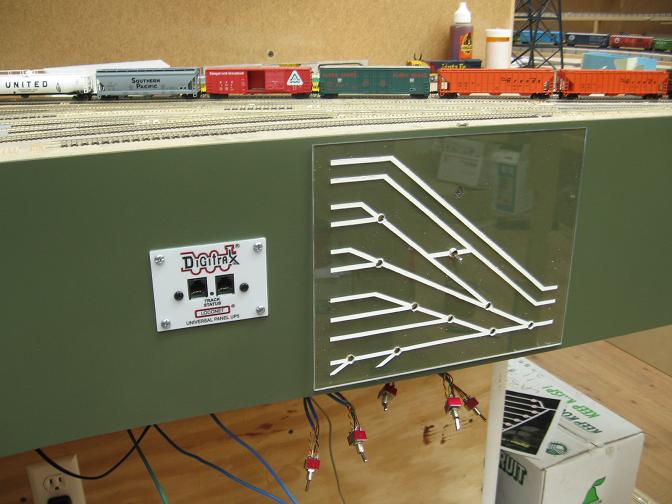 After that was finished, I finally got the initiative to install all the lower level lights. This was a big, time consuming project that I was putting off. There was alot of wood cutting and fixture end fitting to do, installing ballasts and running alot of wire. Now I wish I had done it before any track was put down. Quite a few times one side of the fluorescent bulb dropped and landed on the track. There is one area that I'll have to redo since it bent the rails. But I will say this: boy did it make a huge difference! Along with all this, I added some temporary facia to the yard area, painted in the final "olive green" color, and put together a temporary control pannel. I wanted something to stand out, and I remembered that David Haines did something like this on his Raton Pass layout, using plexiglass with stripes. I wasted 2 pieces of plexiglass before this one turned out how I wanted it. So this "temporary" might turn into "permanent".