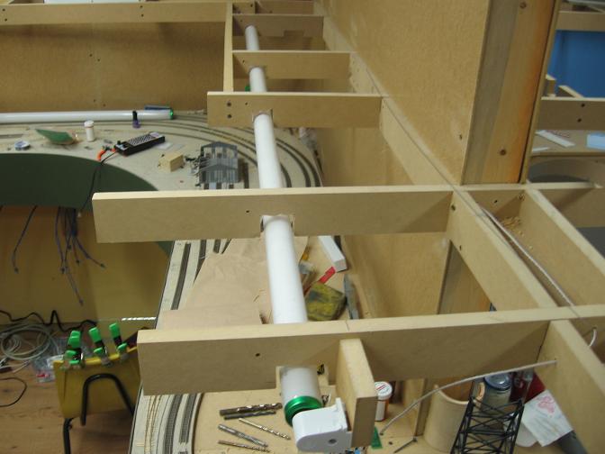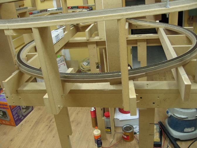 Here is the completed track for the Tonopah branch around the bottom of the helix. You can see the train cars sitting on one of the staging tracks in the upper left.