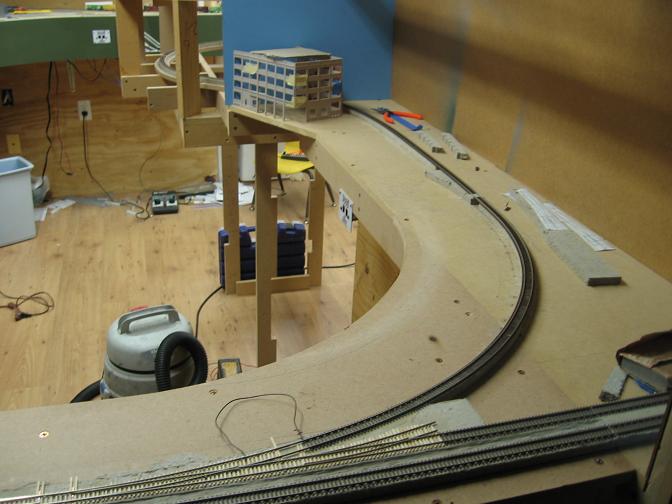 The Tonopah branch line meets the Main line, on the drop bridge no less. The track is just temporary from the end of the curve to just the other side of the building. I have more turnouts to lay in this area.