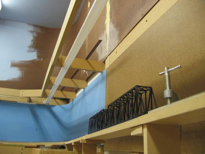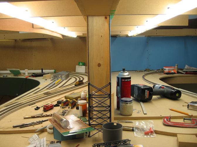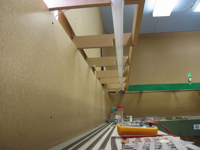 What a difference light makes!!! I clamped some temporary facia to the upper level on the left side, as you can see by the 1/8" hardboard hanging down just below the benchwork and light. With this in place, you cannot see the light when standing in that area.