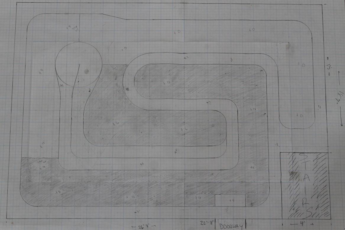 I came up with a kind of hybrid design, trying to maximize the amount of room but still keep isleways in the acceptable range. So the plans below are part mushroom, part double deck, part single deck. Most all the isleways are 3' wide, with a couple sections dropping to 30", and a 24" squeeze point at the helix.