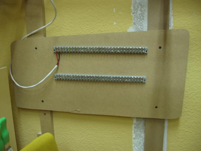 Here is the connection board for all the wires that will run into the laundry room. The track bus wire is connected right now. Eventually this will fill up with switch motor wires, block detection LED wires and 12 volt power wires.
